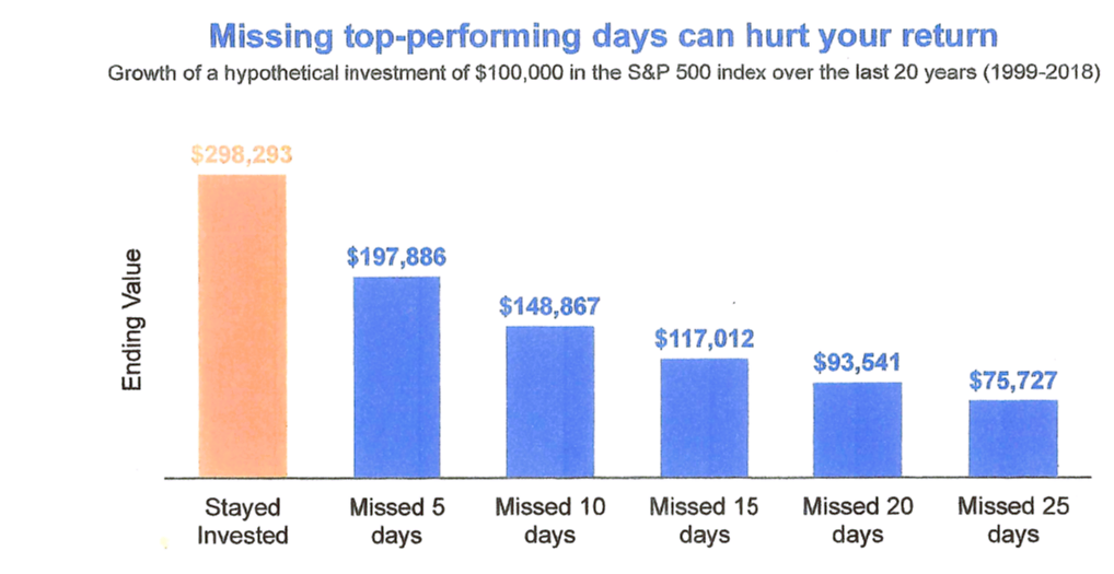 Below are the results of a study showing how investors can’t afford to miss the market’s best days (which often follow the market’s worst days). The study shows actual market performance over a 20-year period ending in 2018.